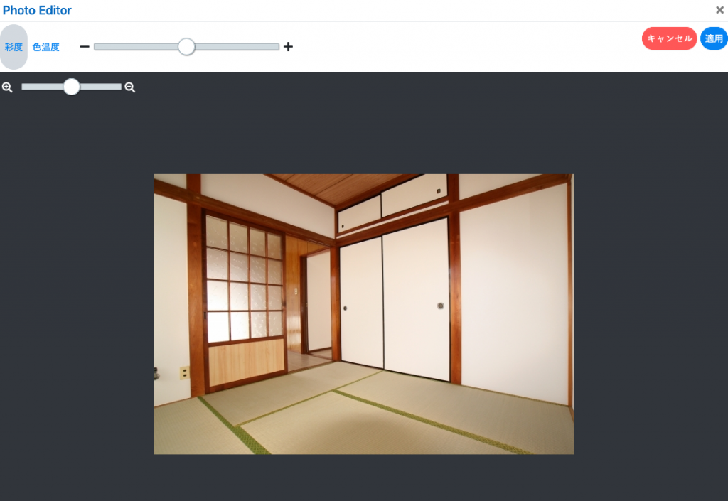 「色」メニューから、色温度を調整します。「色温度」をクリックし、写真の色温度を変更します。元写真は冷たい印象なので、これをスライダーをプラスの方へ動かし、暖かい色に変更します。また必要に応じて「彩度」も合わせて調整します。