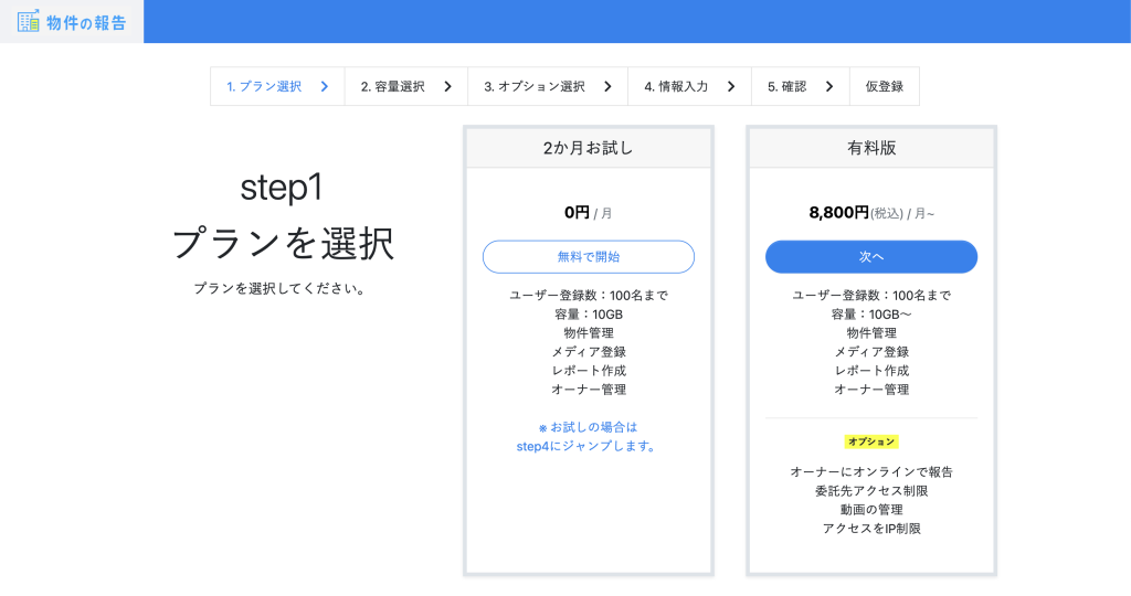 ご利用形態にあわせて選んでください。会社のアカウントに対して課金されますので、ユーザー登録数に制限はありません。導入のご検討にあたり、2か月間の無料のプランをご用意しています。有料プラン(オプション機能なし)と機能は全く同じですので、十分に「物件の報告」の利便性をご確認いただけます。「2か月お試し」からスタートする場合は、step4まで進みます。